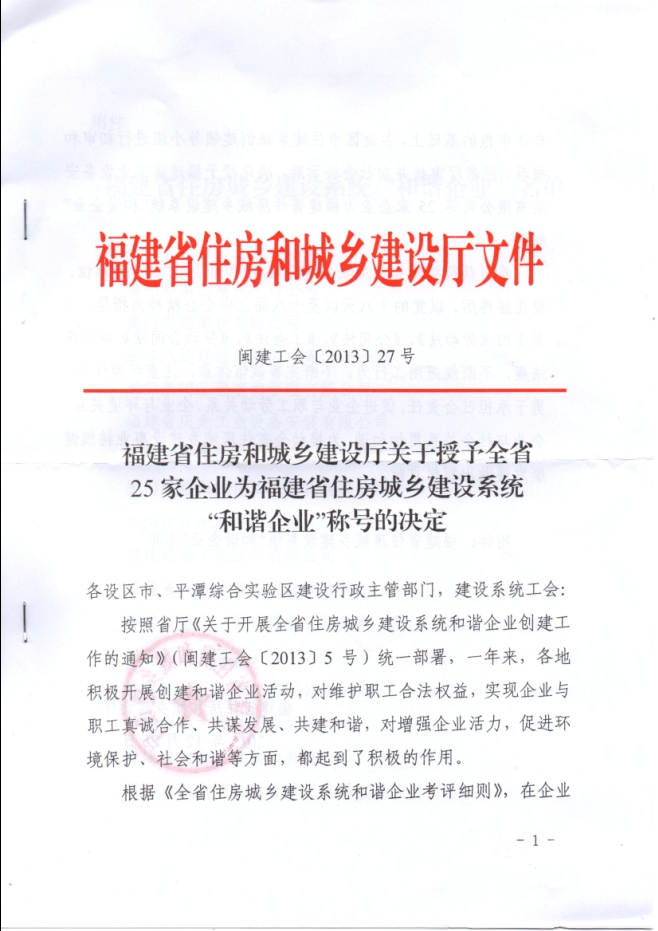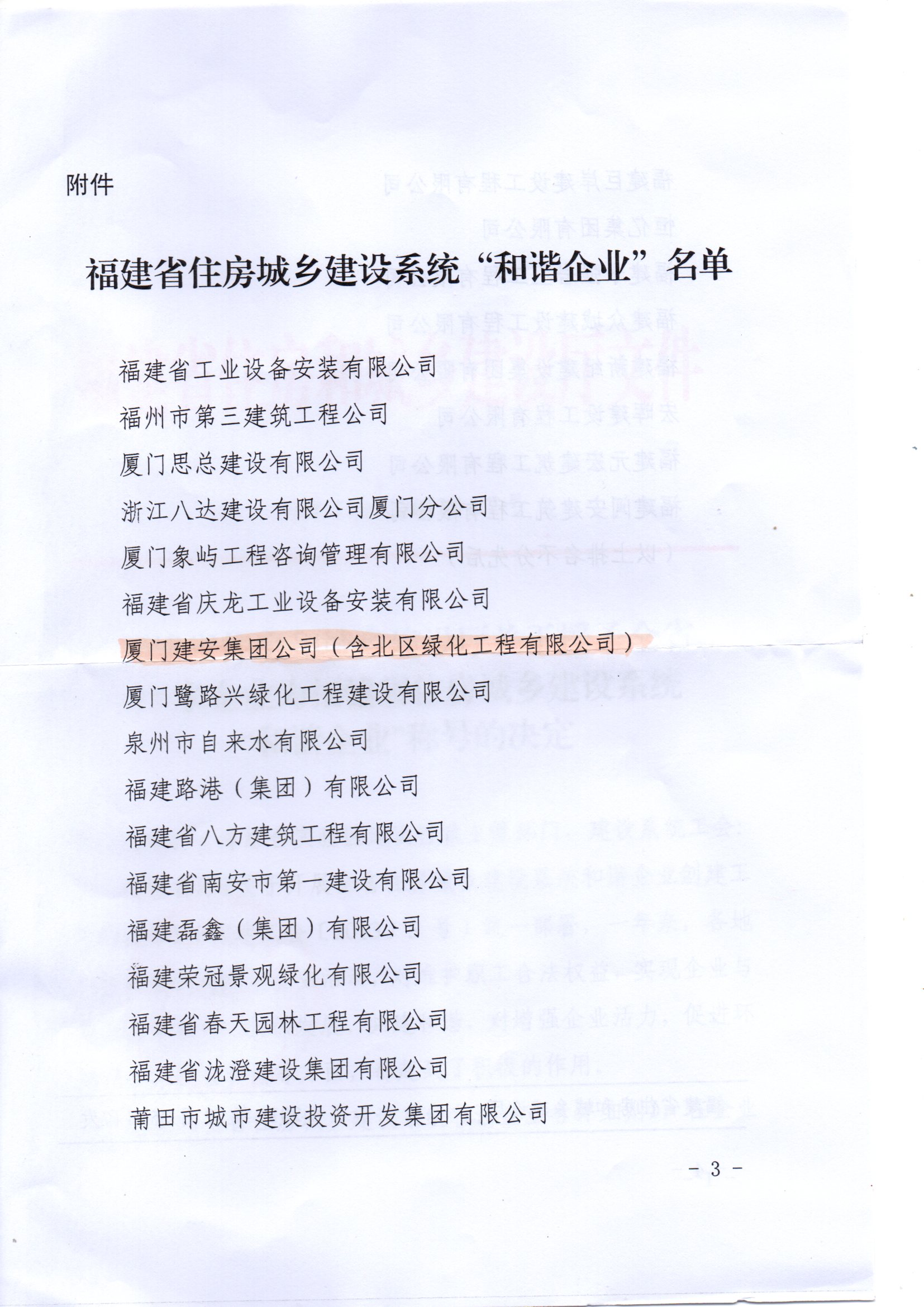 公司(含北區(qū)綠化工程有限公司)被福建省住房和城鄉(xiāng)建設(shè)廳授予福建省住房城鄉(xiāng)建設(shè)系統(tǒng)“和諧企業(yè)”稱號。